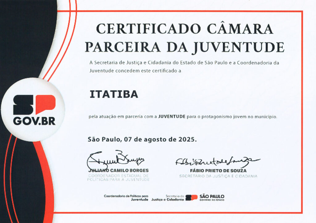 A Câmara Municipal de Itatiba recebeu, na última quinta-feira (07), o certificado “Câmara Parceira da Juventude”, concedido pelo Governo do Estado de São Paulo por meio da Secretaria Estadual de Justiça e Cidadania. A entrega ocorreu durante a oitava edição do evento Conexidades, realizada na cidade de Holambra (SP).