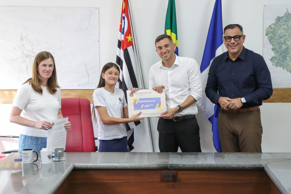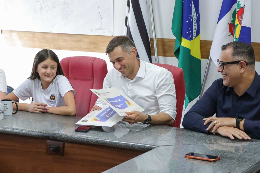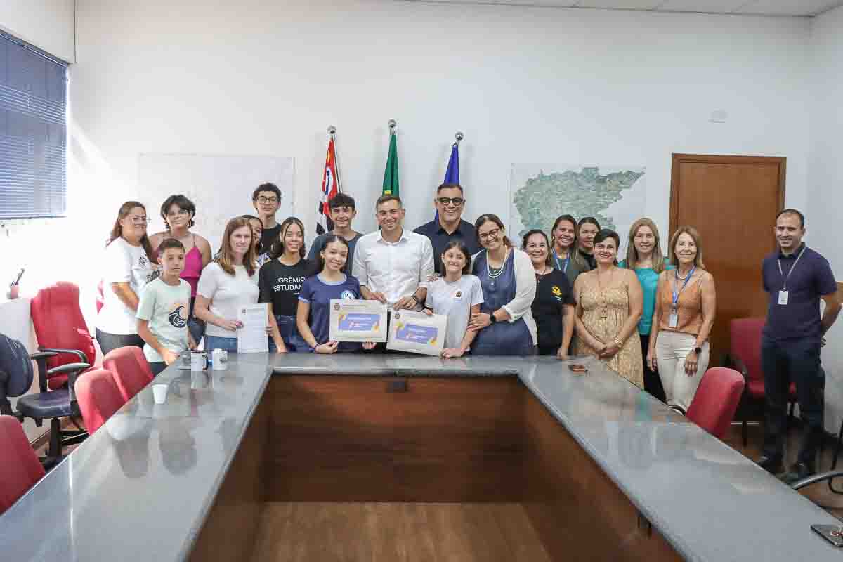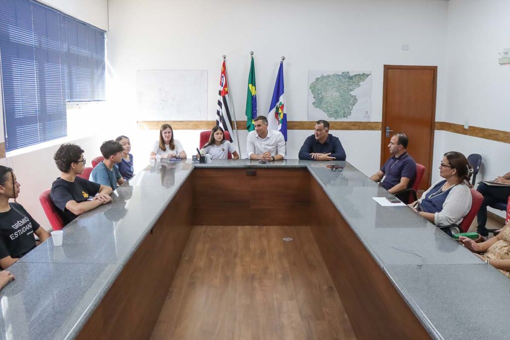 Além dos estudantes e do prefeito, também estiveram presentes o presidente da Câmara, David Bueno; a Secretária de Governo, Jackeline Boava; e a Coordenadora Municipal dos Grêmios Estudantis, Elizabeth Tafarello.